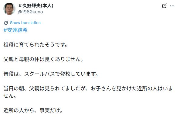 近隣住民の証言によれば、事件当日の朝、父親は見られていたが、結希くんを見た人はいないという。普段はスクールバスで登校していたという情報もあり、当日の動きは通常とは異なっていた。