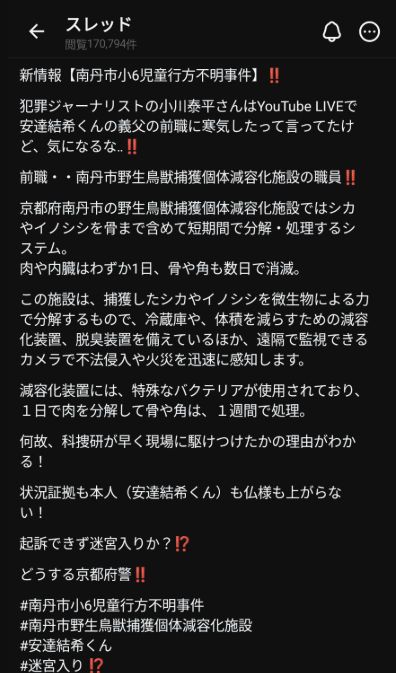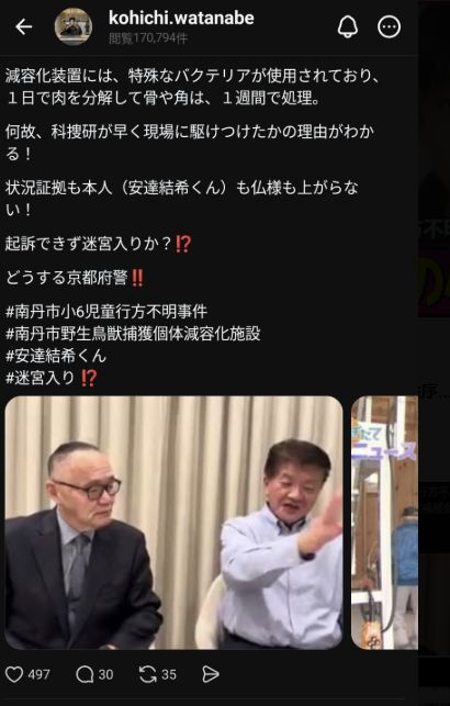 SNSで急速に拡散しているのが、父親の前職が「南丹市野生鳥獣捕獲個体減容化施設」の職員だったという情報です。