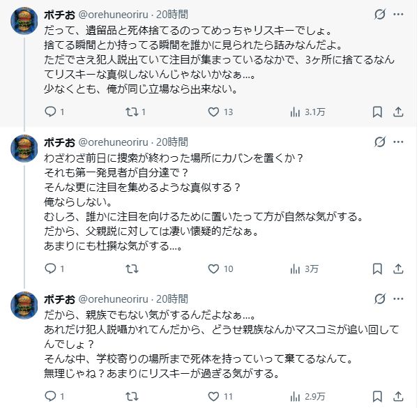 もちろん、現時点では警察が慎重に捜査を進めており、特定の人物を断定する情報はありません。しかし、大家族という特殊な環境を考えると、 「父親だけが犯人である」と決めつけるのは早計であり、 家族全体の生活動線や関係性を丁寧に調べる必要があると考えられます。