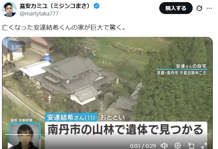 安達結希君の家庭については、SNS上の投稿や近隣住民の証言から、10人以上が同居する“大家族”だった可能性が高いと指摘されています。X(旧Twitter)でも、家の規模や同居人数について触れる投稿が複数見られ、一般的な核家族とは大きく異なる生活環境だったことがうかがえます。