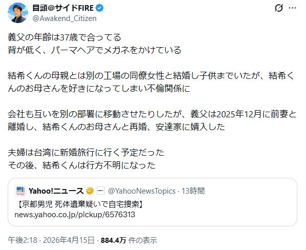 ・お父さんは再婚(去年の12月)した義理の父であり結希君とは血が繋がってない… pic.twitter.com/NmgjSb19qA— 有川健進@伝説の特定班 (@ariken_News) April 12, 2026