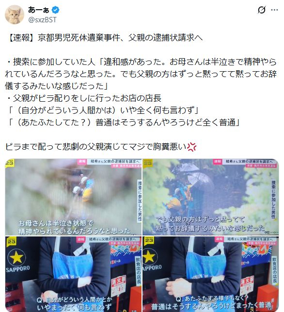 SNSでは、父親の外見情報だけでなく、事件発生後の父親の言動に関する証言も拡散しています。 これらはテレビ報道のインタビュー映像を引用した投稿が中心で、以下のような内容が共有されています。
