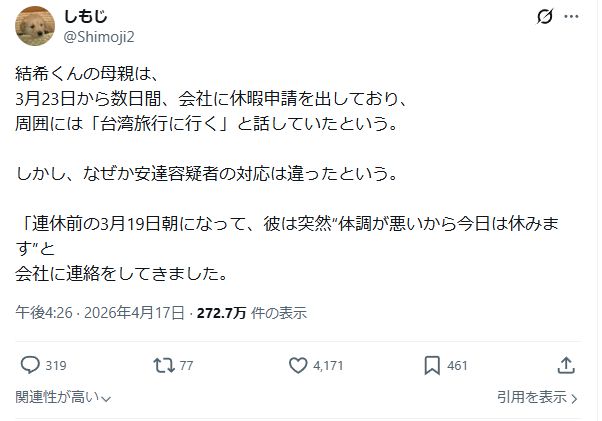 母親は 台湾旅行のため3月19日から休暇を取得 していた一方で、安達優季容疑者は 「ノロウイルスにかかった」として19日の出張を欠勤 していました。