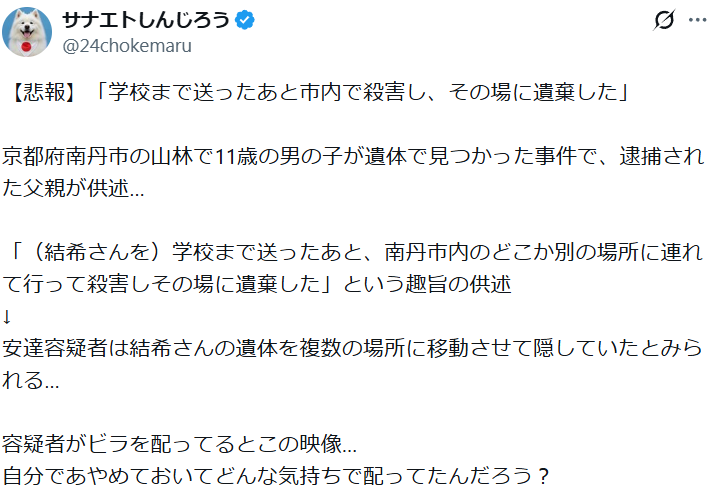 京都府南丹市の山林で11歳の男の子が遺体で見つかった事件で、逮捕された父親が供述…